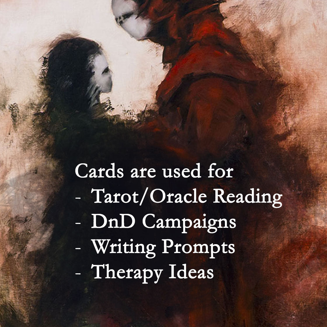 - Instructions on how to use the art cards for Tarot/Oracle reading, DnD campaign ideas, and as writing prompts.