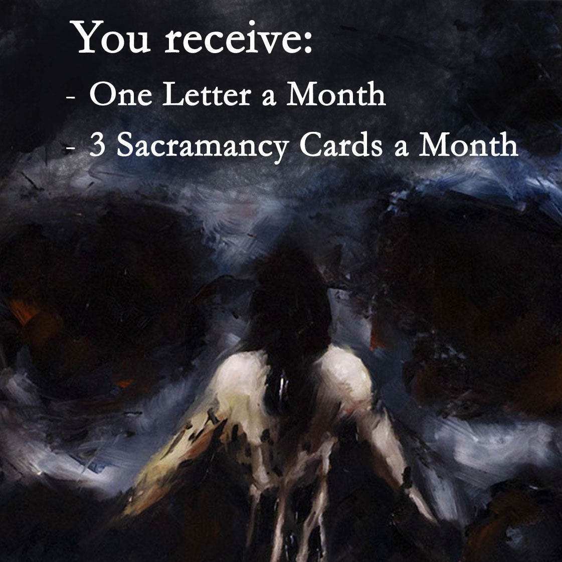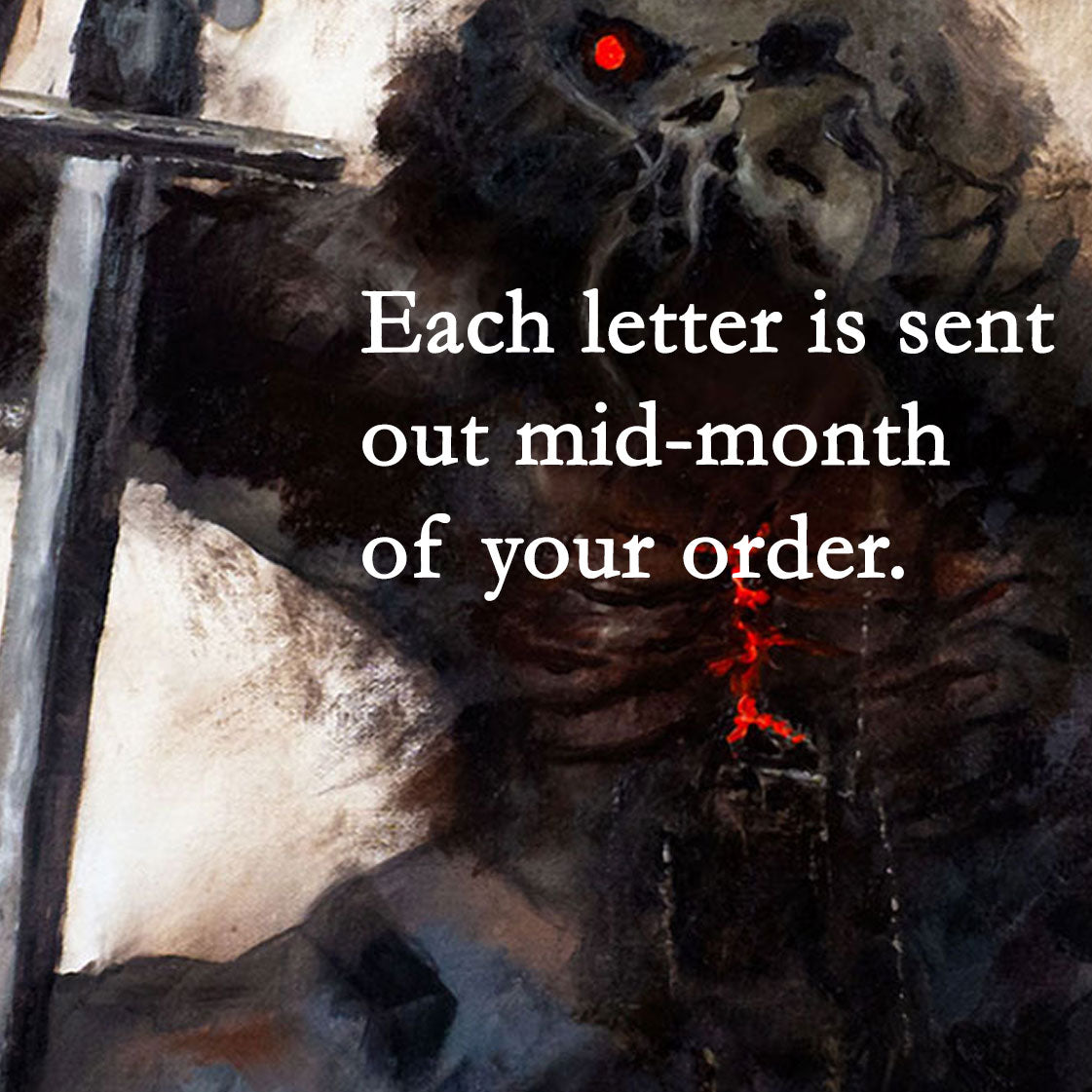 Each month, you’ll receive a 4000-word (approximate) stand-alone short story on faux parchment in the mail. In addition, you’ll get the three cards of the paintings that transported him into the nightmare world.