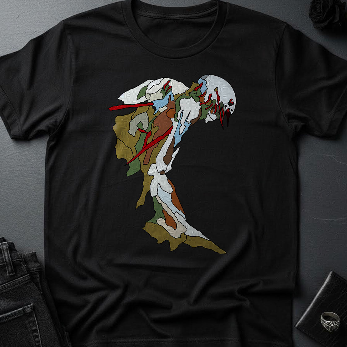 Dark Art meets a stained-glass graphic style look! This dark and beautiful t-shirt is really soft because, well... it's a Bella + Canvas 3001 and they are wicked soft. Each design is an original concept based on one of my oil paintings.